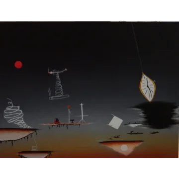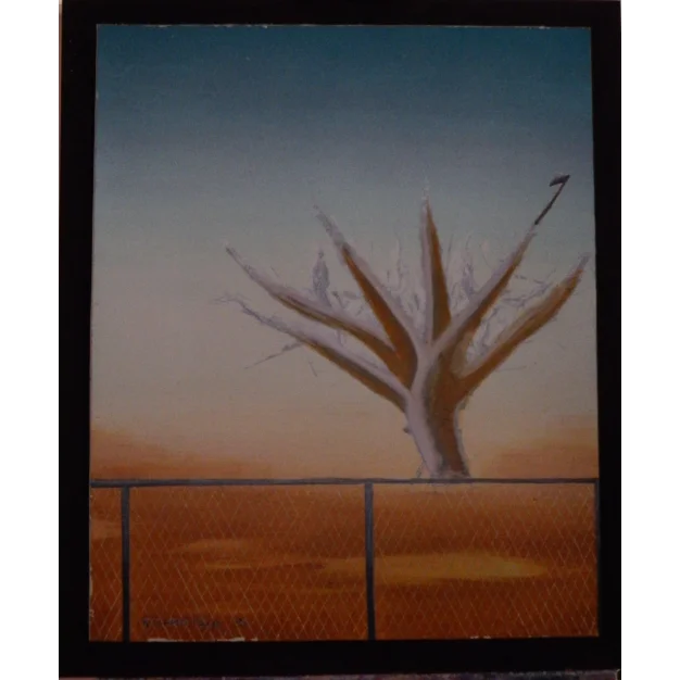 This painting is airbrushed from top to middle with oil paint and later with gesso. I call it freedom tree because there are no boundaries, the tree chops away. And on the left branch sits a guard.